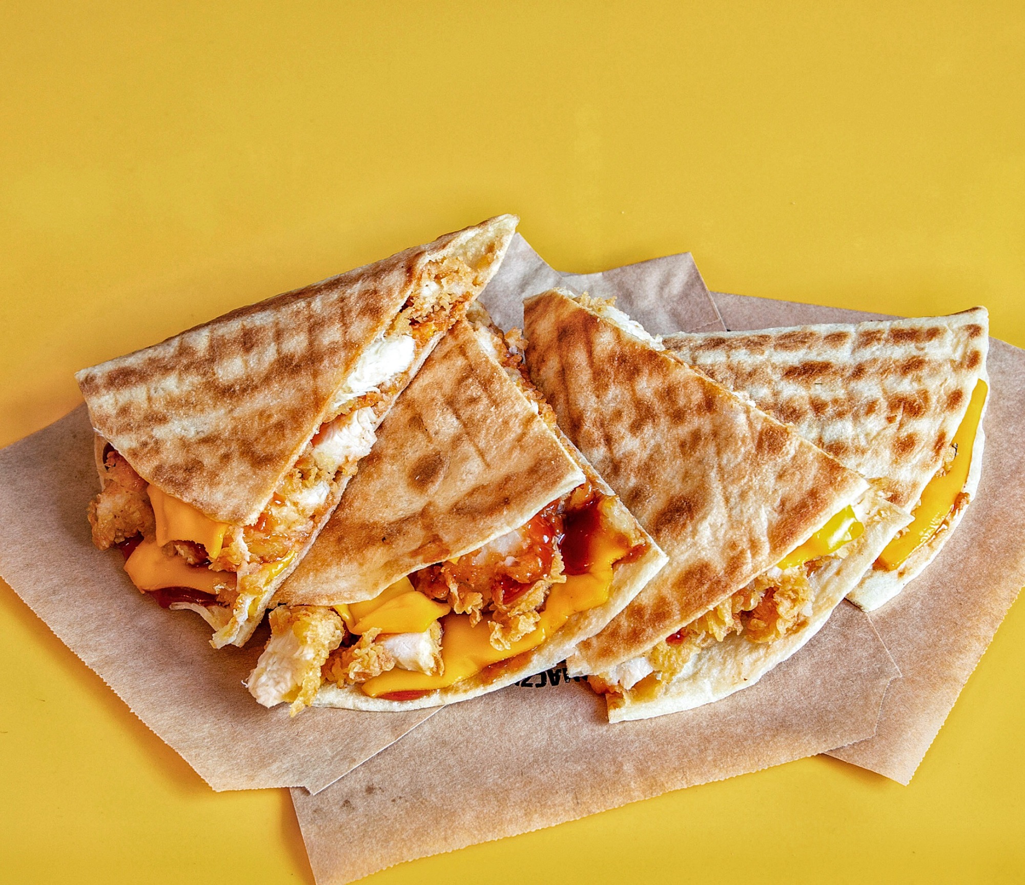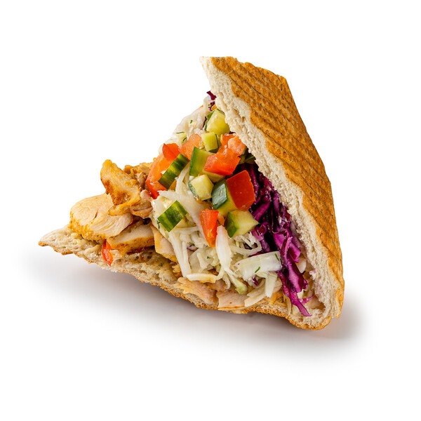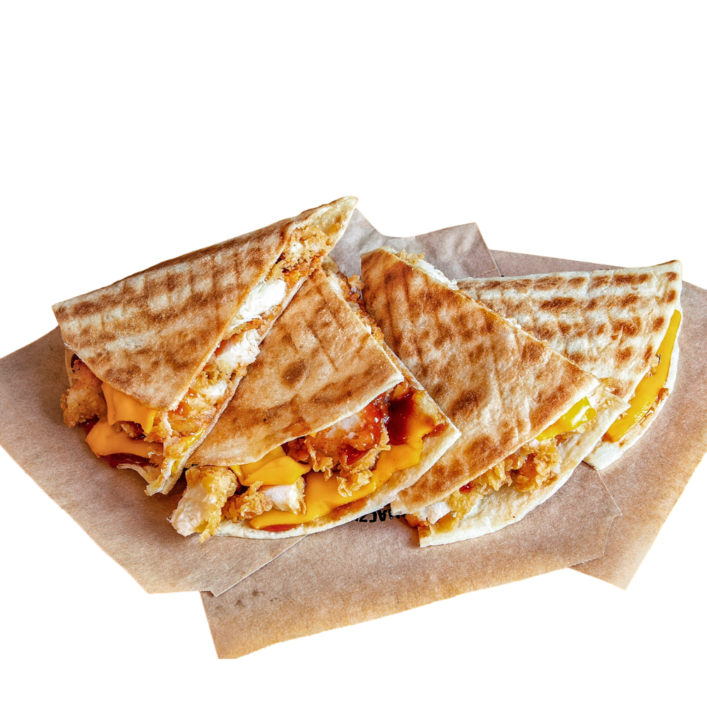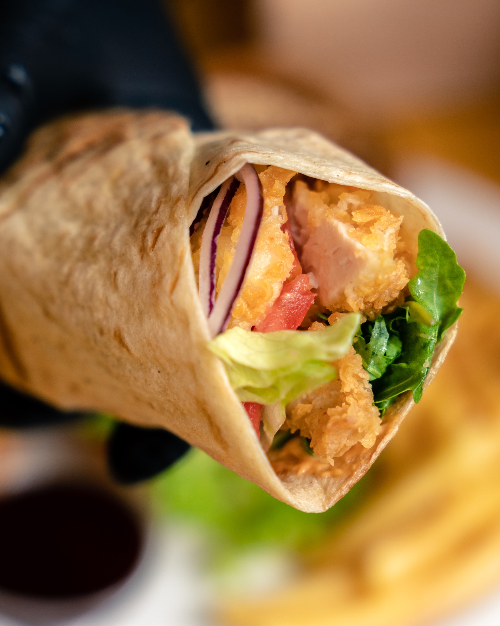 tortilla pszenna, 3 vege polędwiczki, sałata, ser cheddar, pomidor, jalapeno, czerwona cebula, sos ostry, ketchup -