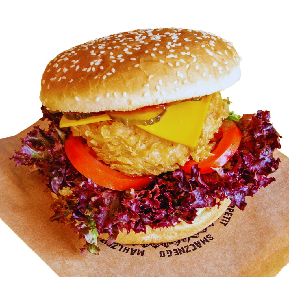 bułka maślana, 2 vege polędwiczki, sałata, ser cheddar, vege bekon, ogórek kiszony, sos bbq, majonez -