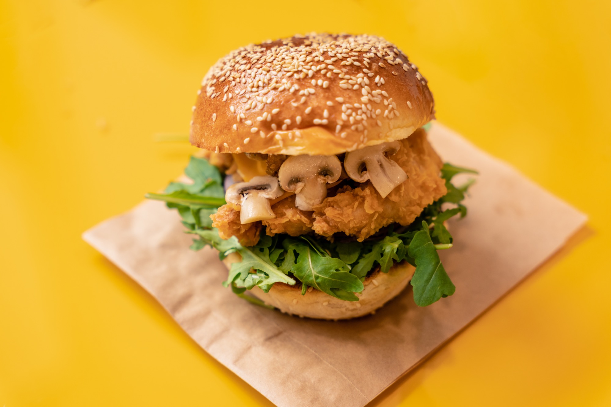 bułka maślana, 2 vege polędwiczki, rukola, ser cheddar, grillowane pieczarki, czerwona cebula, majonez -