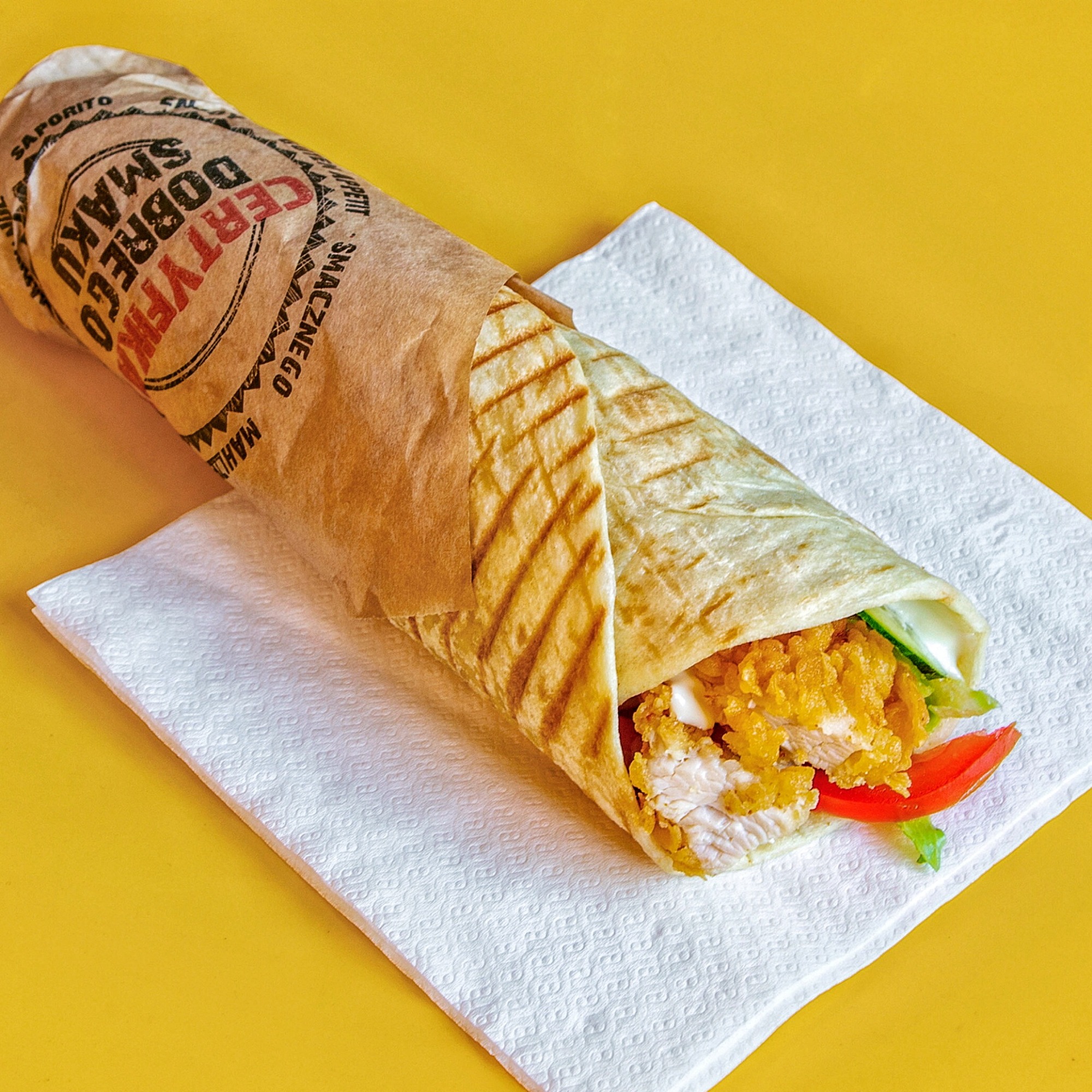 tortilla pszenna, 3 vege polędwiczki, sałata, ser cheddar, pomidor, ogórek, majonez, ketchup -